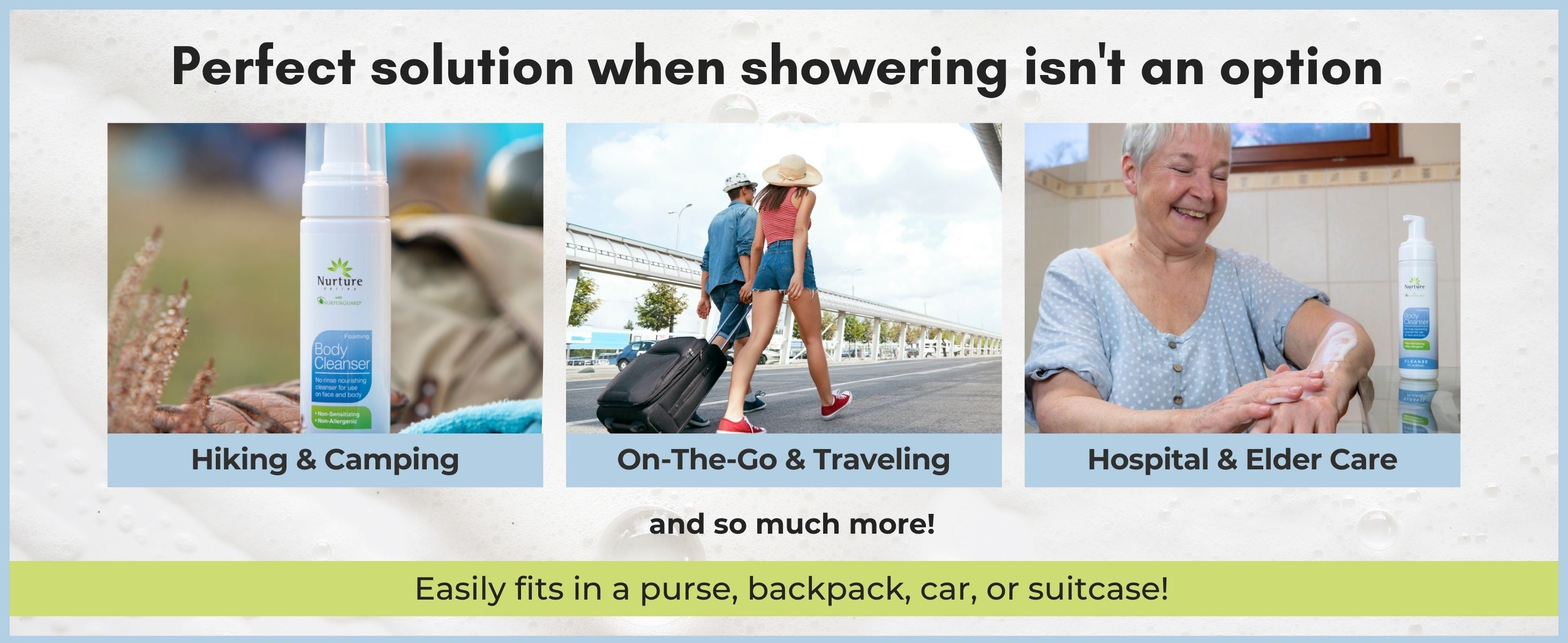 No Water Needed: Nurture Valley's No Rinse Cleansing Foam & Body Wash stands out as a travel essential, perfect for outdoor activities like camping, backpacking, or roadtripping, as well as for situations where traditional bathing isn't an option. This versatile product doubles as a hand, body, and face soap, offering a convenient, all-in-one solution for on-the-go cleanliness and freshness.
