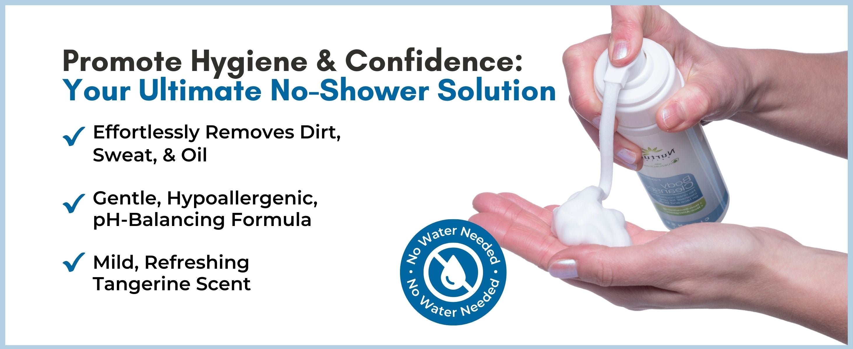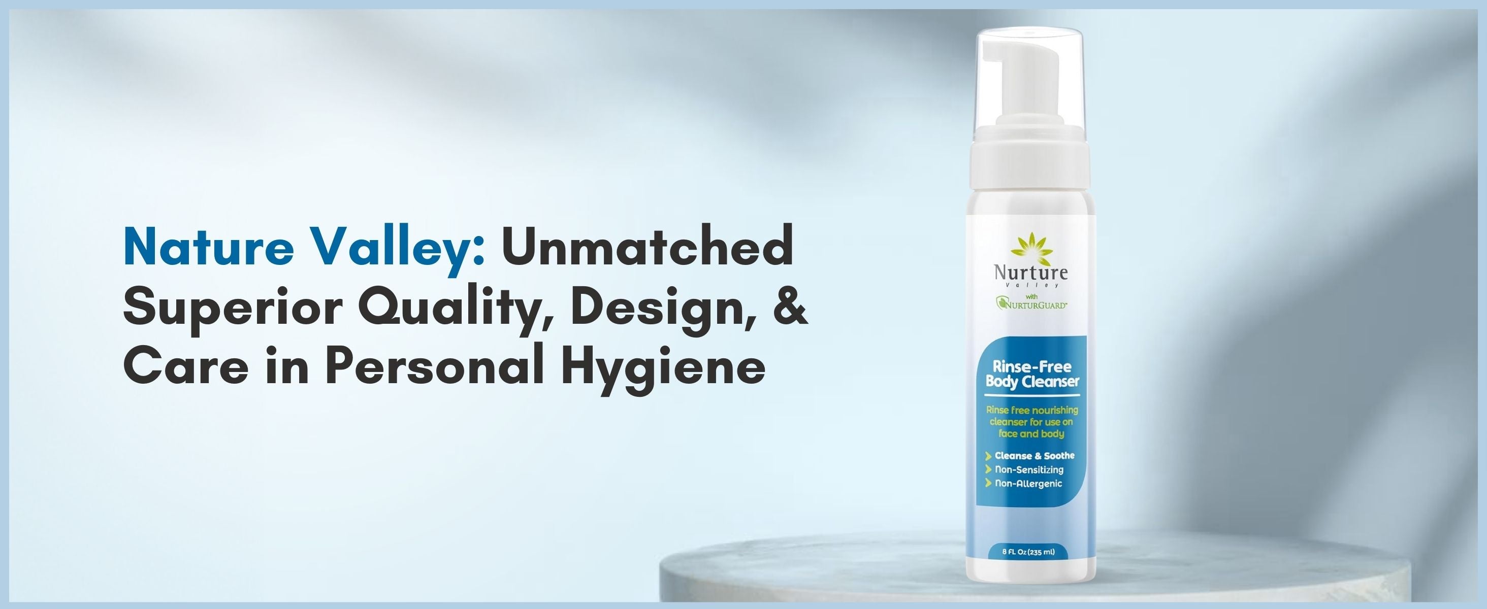 Nurture Valley's Waterless Foaming Cleanser: This innovative cleanser provides a water-free bathing experience, ideal for adults who need a gentle yet effective cleansing solution. Infused with Aloe Vera and a blend of skin-nourishing natural ingredients, it offers a convenient, soothing, and hydrating option for those unable to access traditional water baths or showers, ensuring a clean and refreshing feel every time.