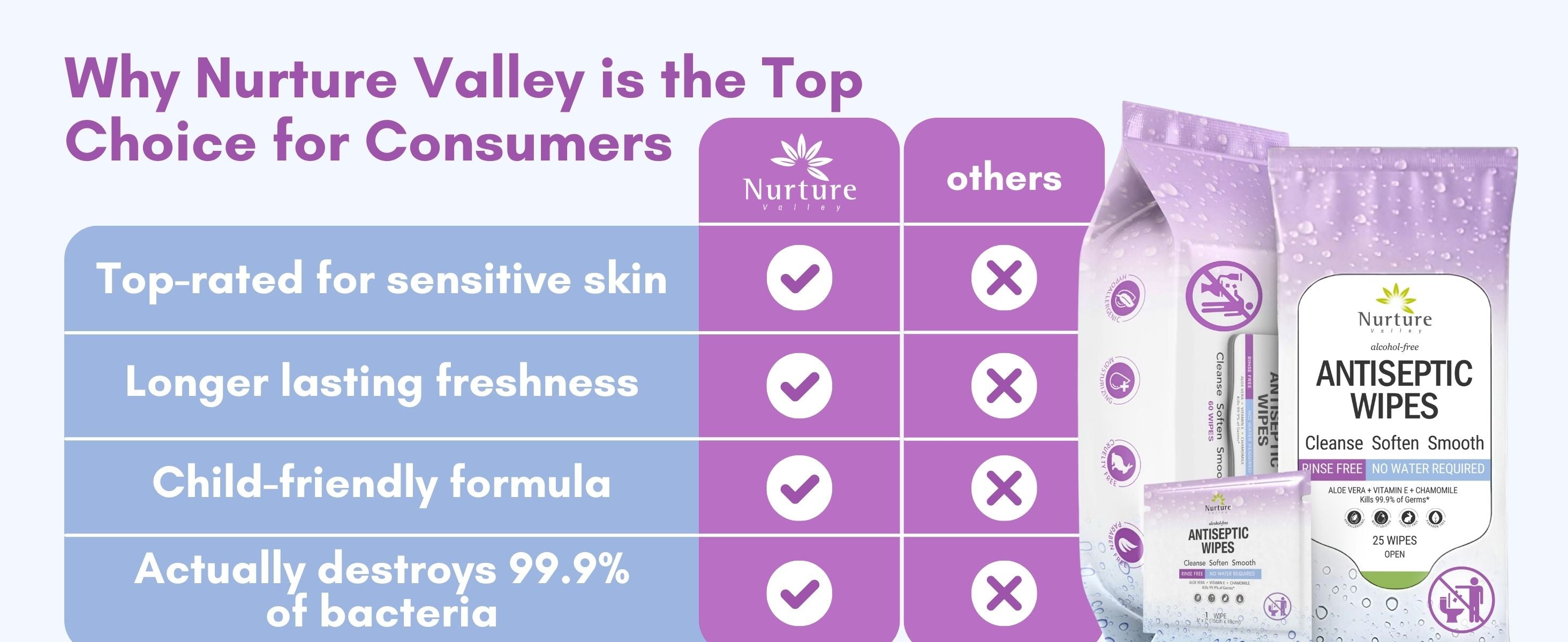 Trusted in healthcare and at home care, Nurture Valley Antibacterial Wipes excel in upholding the highest standards of health and hygiene. See for yourself how Nurture Valley Antibacterial Wipes offer superior protection against common germs, standing out from other brands.