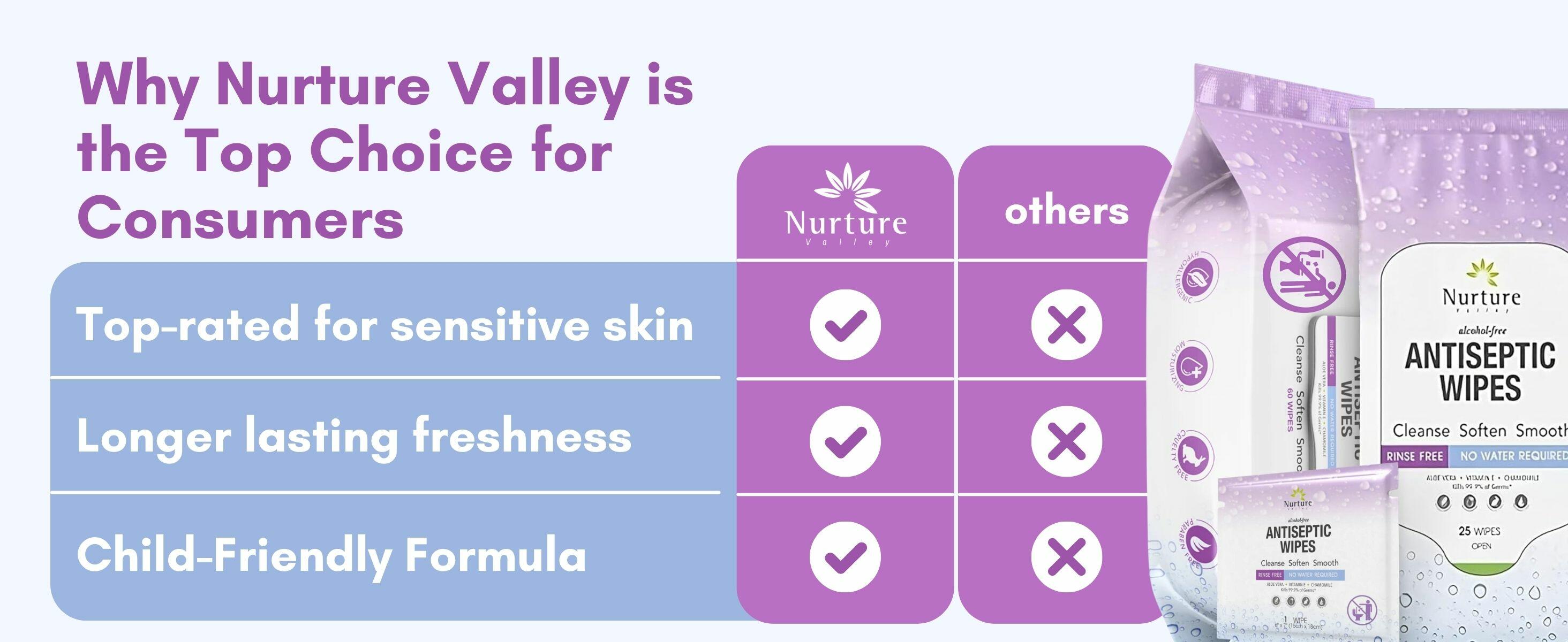 Trusted in healthcare and at home care, Nurture Valley Antibacterial Wipes excel in upholding the highest standards of health and hygiene. See for yourself how Nurture Valley Antibacterial Wipes offer superior protection against common germs, standing out from other brands.
