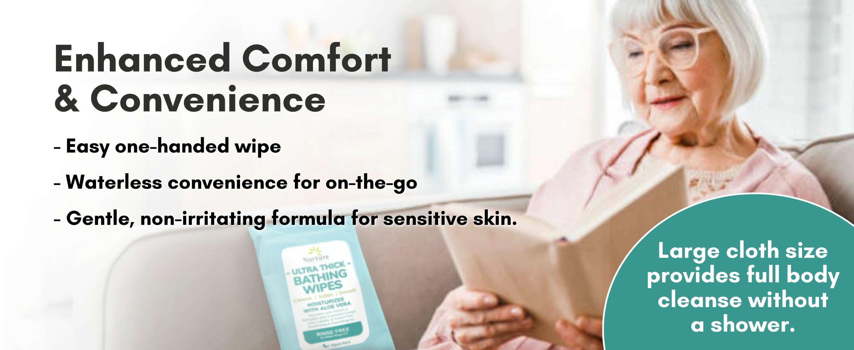 12 Packs of 10 Nurture Ultra-Thick Bathing Wipes: Our industry-leading, extra-durable wipes ensure full-body cleanliness without the need for water.